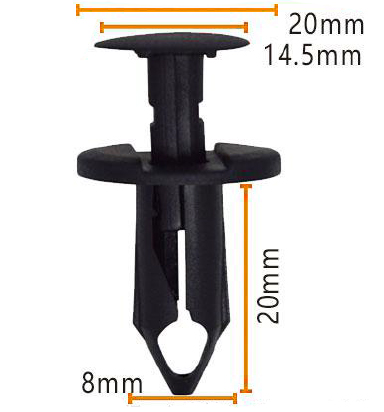 Цела кліпа вымярае 20 мм у даўжыню і звужаецца да 8 -мм шырокай асновы, што дазваляе яму шчыльна ўпісвацца на месца і падтрымліваць стабільнасць нават пад ціскам. Унікальная канструкцыя гэтых кліпаў дазваляе выкарыстоўваць іх у шырокім дыяпазоне галін, уключаючы аўтамабільную, будаўнічую і вытворчую.