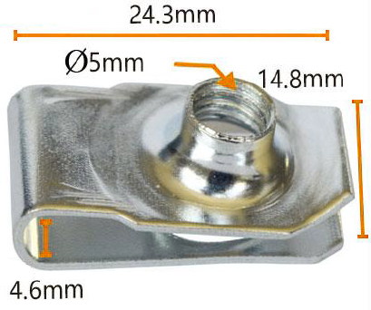 Зашпілька мае дакладныя агульныя памеры, памерам 24,3 мм шырынёй і вышынёй 14,8 мм, забяспечваючы бесперашкоднае ўкладванне кропак мацавання на вашым аўтамабілі. Акрамя таго, даўжыня 4,6 мм, згаданая ўнізе малюнка, можа ставіцца да крытычнага вымярэння пэўнай часткі, падкрэсліваючы прафесіяналізм і дакладнасць прадукту.